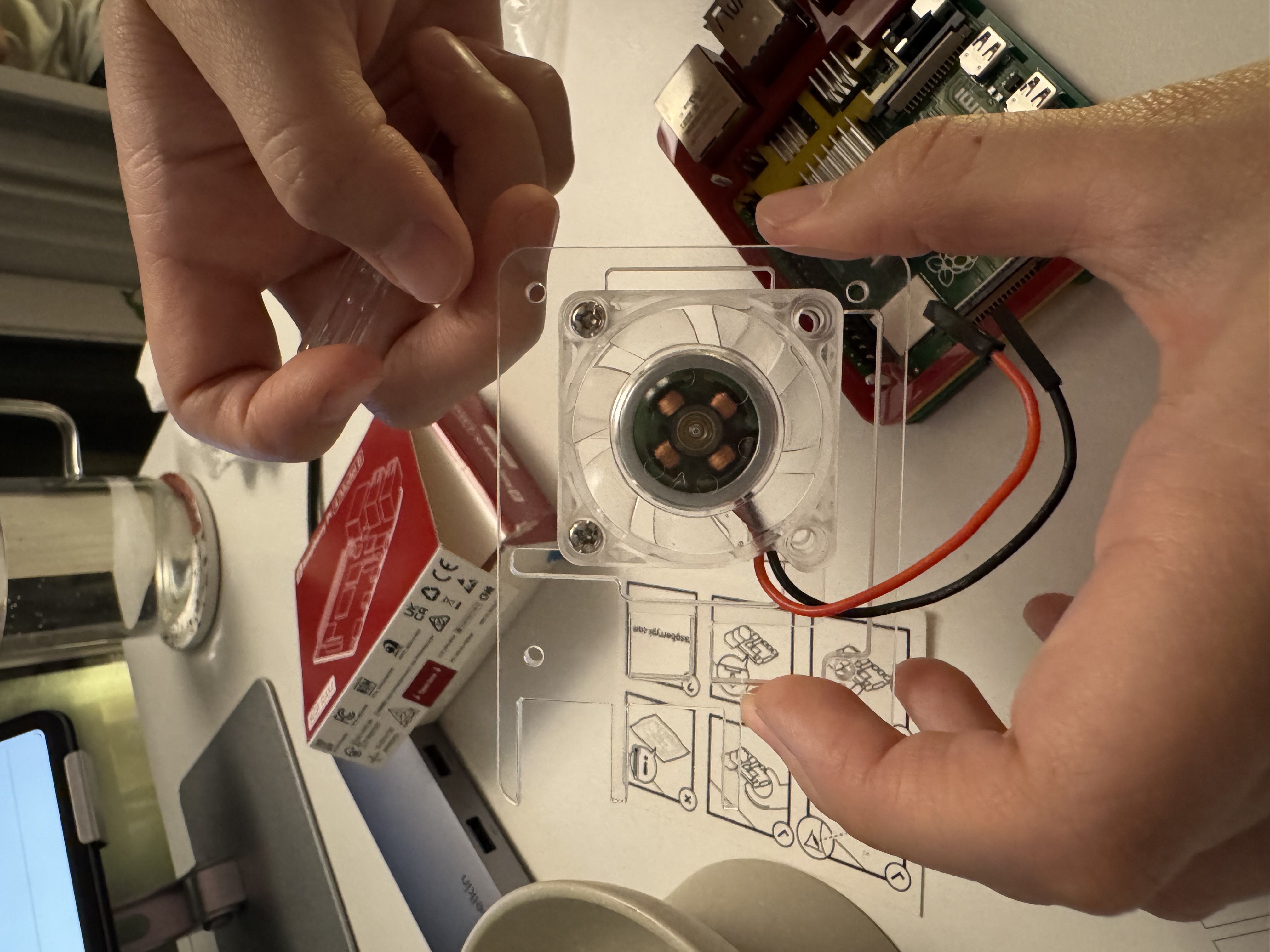 고정핀을 끼우기 전에, 맨 위 투명 판에 쿨링팬을 부착해야 한다.